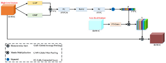 where and represent convolutional kernels of FCs. refers to the sigmoid function. denotes the ReLU activation function. Subsequently, convolution is performed on the low-level feature to obtain . Next, matrix multiplication is performed between and to acquire . Finally, an elementwise summation is used between the high-level feature and to achieve the final output.