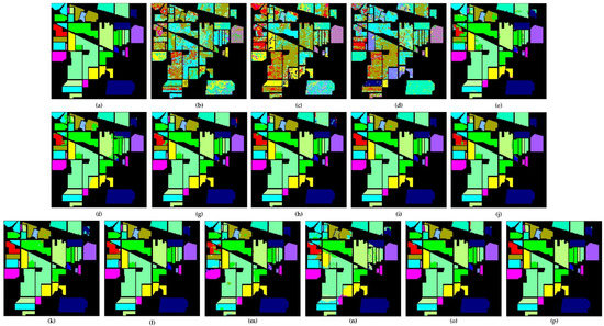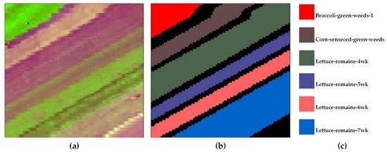 The Salinas (SA) dataset [54] is acquired by AVIRIS sensor over the Salinas Valley of California. It has 16 ground-truth categories and a spatial resolution of 3.7 m per pixel. The original SA dataset is , and its wavelength ranges from 0.4 to 2.5 µm. After removing some spectral bands cannot be reflected by water, the corrected SA dataset includes 204 bands.