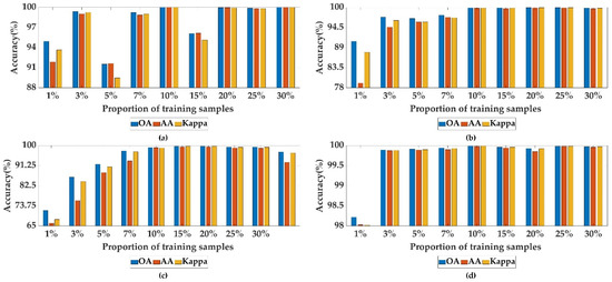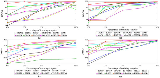 OA of different methods for different percentage of training samples on four HSI data sets: (a) SAC dataset; (b) UP dataset; (c) IP dataset; (d) SA dataset.