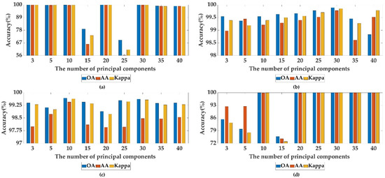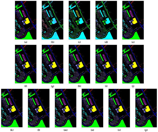 The University of Pavia (UP) [10] is acquired by a reflective optics system imaging spectrometer (ROSIS-03) sensor over the campus of the University of Pavia, Italy. It is composed of 9 ground-truth categories and a spatial resolution of 1.3 m per pixel. The original UP dataset is , and its wavelength ranges from 0.43 to 0.86 µm. Due to the existence of a high amount of noise, the corrected UP dataset includes 103 bands.