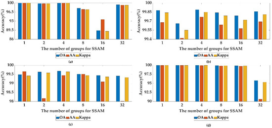 To fully validate the effectiveness of SSAM, ablation experiments are performed on the four HSI datasets, i.e., our proposed SSAM, eliminating channel attention (spectral-spatial), and eliminating spectral-spatial attention (channel). Table 9 provide the classification results of different schemes on the four datasets, respectively. Compared with the spectral-spatial, the OA, AA and Kappa of channel are almost higher. This is because the network structure of spectral-spatial is relatively complex, and it needs more training parameters and labeled samples. From Table 9, we can explicitly see that our proposed SSAM obtains much better classification performance compared with the channel and spectral-spatial, whose evaluation indexes almost exceed 99%. Although the network structure of our proposed SSAM is more complicated, the SSAM can fully capture local and global spectral-spatial features separately and learn the interdependency of spectral and spatial information. These experimental results further prove that our proposed SSAM is beneficial for improving HSI classification performance.