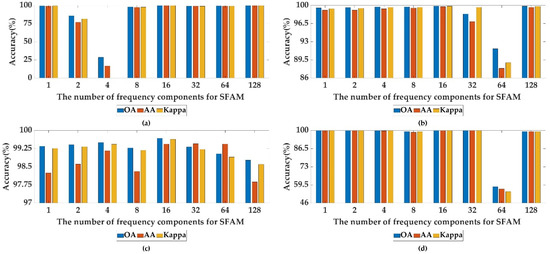 We also introduce the SFAM to case3 to adaptively compress the spectral channels and introduce multiple frequency components. From Table 11, we can clearly see that case3 obtains superior classification accuracy, which demonstrate the SFAM is effective. For instance, case3 achieves 98.44% OA, 94.01% AA, and 98.22% Kappa on the IP dataset, which are 10.8%, 23.65% and 12.24% higher than case2.