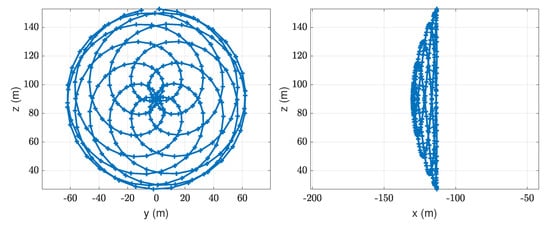 The SpinnerLidar [,] is one high-resolution lidar device that satisfies the requirement of fast scanning of the rotor area. This research-based prototype lidar can perform 2D measurements of the radial line-of-sight wind speed on a spherical surface with very high spatial and temporal resolution. The lidar consists of a modified ZephIR-300 continuous-wave Doppler lidar with a 2D scan head developed by the Technical University of Denmark (Figure 1). The scan head consists of two rotating prisms deviating the lidar’s focused beam by an angle of 15 while rotating at a fixed ratio of 7 to 13. The resulting scanning pattern movement creates a fast rosette trajectory covering a large area with a quasi-homogeneous spatial resolution. The lidar can sample up to a maximum of 500 radial line-of-sight measurement points distributed over each completed scan trajectory (Figure 2). The lidar is capable of providing 2D wind field scans at a temporal sampling rate of 1 Hz with a variable focal distance from 10 to 150 m (albeit with a constant opening angle of 30). The probe length is 0.13 or 28.3 m at f = 10 m and f = 150 m, respectively.