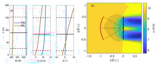 To obtain a convective boundary layer (CBL), we performed a pre-run of 25 h to allow the boundary layer to develop and reach stationary flow. A roughness length m was specified with a friction velocity = 0.52 m/s, and the kinematic sensible heat flux at the surface was fixed at 0.023 K ms. The surface potential temperature was 290 K. The instantaneous fields of the precursor simulation were mapped onto the main simulation via turbulence recycling [], where the turbine was introduced into the wind field. For simulating stable atmospheric conditions (SBL), a pre-run of 25 h was carried out, where the lowest grid cells were constantly cooled at a rate of 0.25 K/h. A roughness length of m was specified, and a temperature gradient of 1 K/100 m was specified. Similarly to the CBL case, the turbine was introduced in the main run, where the precursor simulation was mapped onto the main simulation. Important details of the precursor and the main run are summarised in Table 1. The dimensions of the simulation domain and were normalised with the rotor diameter of the NREL 5 MW turbine. The mean longitudinal wind speed and turbulence intensity were defined as and , respectively. The wind veer was calculated between the top and bottom rotor tips, and was the vertical shear exponent. was the roughness length, and the stability was characterised by the Obhukov length L.