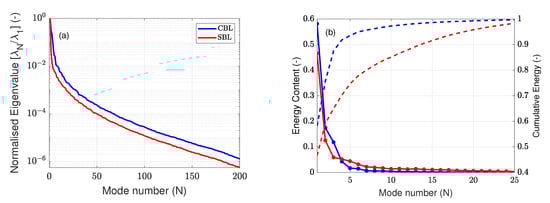 The normalised magnitudes of the eigenvalues and the fraction of energy associated with each mode of the measurements are shown in Figure 4. As expected, the eigenvalue magnitudes of the CBL modes contain more energy in general compared to the SBL modes due to the higher turbulence in the CBL. For the unstable case, the first POD mode contains 57.7% of the total measured energy; and the second, third, and fourth modes contribute 17.3%, 11.8% and 4.3%. For the stable case, the energy contributions of the first modes are 48.01%, 12.91%, 6.07% and 5.38%, respectively. It is clear from Figure 4b that the first ten modes contribute 96.6% and 87.7% of the measured turbulent kinetic energy (TKE); and the first 100 modes account for 99.95% and 99.99% for the CBL and SBL cases, respectively. Note that the total TKE measured by the lidar is not equivalent to that in the wind field due to volume averaging induced turbulence attenuation of the line-of-sight measurements. This may be surprising since, in a turbulent flow, energy is distributed over the different scales and its representation might usually require a large number of modes []. However, a lidar system acts as a low-pass filter for small scale turbulence due to its volume averaging property. Hence, the small scale turbulence is filtered out, and an accurate representation of the remaining lidar measured total TKE can be recovered with very few modes.