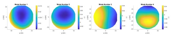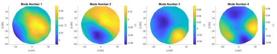 The first four POD modes for the CBL and SBL cases are illustrated in Figure 5 and Figure 6, where well defined modes for both cases were obtained. For both cases, the modes exhibit clear structures that trend towards smaller scales with increasing mode number as the modes are sorted based on the energy content, and the kinetic energy decreases with scale. For the CBL case, modes 1 and 2 have similar mode shapes with different gradients, resulting from the variation in the line-of-sight velocities decreasing toward the edges of the scan pattern. The first two modes do not exhibit clear symmetry around the rotor axis due to the slight wind shear present in the ABL. Modes 3 and 4 display variations in the horizontal and vertical directions, respectively. For the SBL case, the first mode shows a strong spatially localised shape related to the line-of-sight velocity distribution, and the second mode resembles a large gradient in the vertical direction, probably due to the strong vertical shear. The third mode displays variations in the horizontal direction, and the fourth mode shows a slightly more complex distribution. The asymmetry of the SBL modes could be explained by the larger surface roughness of the simulation ( m) leading to a large effect of the ground on the inflow. Comparatively, the CBL was generated with less surface roughness ( m), thereby preserving weak statistical isotropy commonly observed in turbulent flows. As expected, the higher mode patterns became increasingly complex compared with the first few modes.