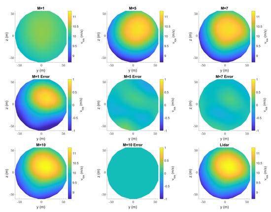 where is the set of rotor-averaged wind field parameters calculated by applying a three-parameter methodology to the line-of-sight velocities. Similarly, the wind field parameters determined from the reduced-order reconstruction with M modes can be represented as: