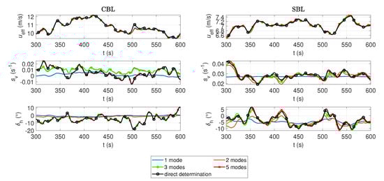 Figure 8 contains part of the time series of the three wind field parameters for different reconstructions with , 2, 3, 5 and 10 for the CBL and SBL cases, respectively. For the rotor effective wind speed , the time series of the different reconstructions overlap with each other well, even for reconstructions with few modes for the CBL and the SBL cases. The dynamic aspects of the rotor effective velocities calculated with different mode numbers are similar, there being only small variations between the reconstructions with and modes. The low-frequency characteristics of the time series were reproduced with reasonable accuracy with just one mode. The addition of more modes to the reconstruction introduced a few high-frequency variations to the time series. However, this was not the case for vertical shear or yaw misalignment. The reconstruction of with one mode for the CBL case showed an average value of zero, whereas for the SBL case a value of 0.025 s was obtained, indicating that the first mode contained some vertical shear information. With the addition of the second and third modes to the reconstruction, we observed that the dynamics of the vertical shear were captured, albeit a little over-predicted for the CBL case. The horizontal misalignment reconstruction for CBL and SBL showed very similar behaviour. With the first mode alone, the basic dynamics of the time series were not captured. The addition of more modes to the reconstruction improved the estimation of both and . For or higher, good agreement between the direct determination and the truncated reconstructions was obtained for all three parameters for both cases.