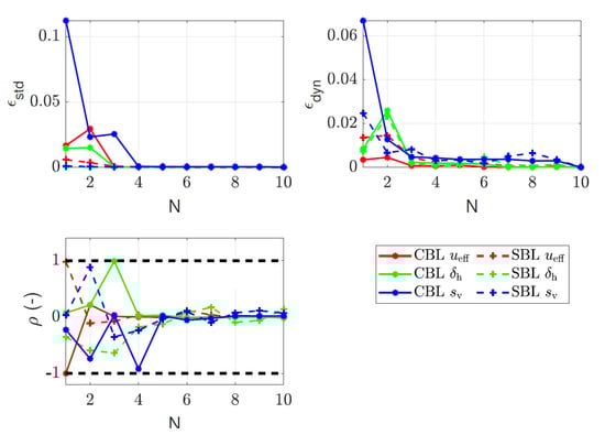 where and represent the standard and dynamic error, respectively. These values quantify the respective mean error and the error associated with the fluctuations in the wind field. The definition of the dynamic error was motivated by the fluctuation of wind field parameters having the largest effect on the loading and the fatigue of the turbine in contrast to the mean wind field parameters. To investigate the relationship between the POD temporal gains and the wind field parameter time series, the Pearson correlation coefficient is used [].