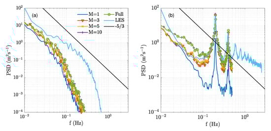 The dynamic loading induced on the turbine blades is determined by the wind fluctuations impinging on the blades and how quickly they rotate. As the blades move through the turbulent wind field, they perform a so-called “rotational sampling” of the turbulent structures, which differs from the velocities observed at a stationary point []. To investigate this effect, we calculated the auto-spectral density of the longitudinal wind speed of the reduced-order reconstruction for the stationary hub centre and rotating reference frames for a radial position of 90% on the first blade only for the CBL case. The reconstructed spectra are evaluated with respect to the turbulent spectra directly determined by the lidar measurements and the reference LES (Figure 10).