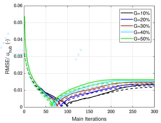 where represents the reconstructed data, represents the reference data with 100% availability and is the number of missing points. The sub-iteration convergence was investigated by inspecting the absolute normalised difference between the eigenvalue spectra between consecutive iterations. In this work, the value was chosen as 0.05. If the convergence criteria was not satisfied, the guess for the missing data was updated using Equation (10) and the next sub-iteration was started. The variations in RMSE with the number of main iterations and for different gappiness G are plotted in Figure 11 for the CBL and SBL cases. The RMSE was normalised by the hub height wind speed to facilitate comparison between the two cases.