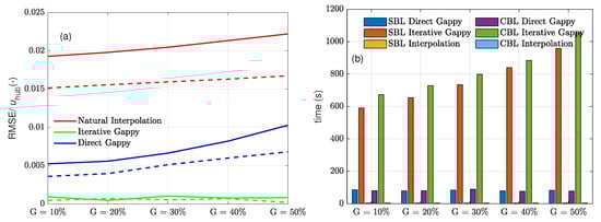 where denotes cardinality. The removal of points was based on defining a set of uniformly distributed pseudo-random integers consistent with the total number of measurement points using the Mersenne–Twister algorithm []. Different gappiness scenarios were created by randomly removing 10%, 20%, 30%, 40% and 50% of the data points from the CBL and SBL cases. Gappy-POD was applied to the gappy datasets, and the ability of the method to reconstruct missing points was evaluated. While removing measurement points, it was made sure that there were no data points with no data and no snapshot that was missing all measurements. Determining the convergence, i.e., the termination point of the iterative process, is necessary to achieve high accuracy. For this purpose, a convergence criterion based on the root mean square error (RMSE) was utilised only at the locations of the missing points; i.e., valid data points were ignored.