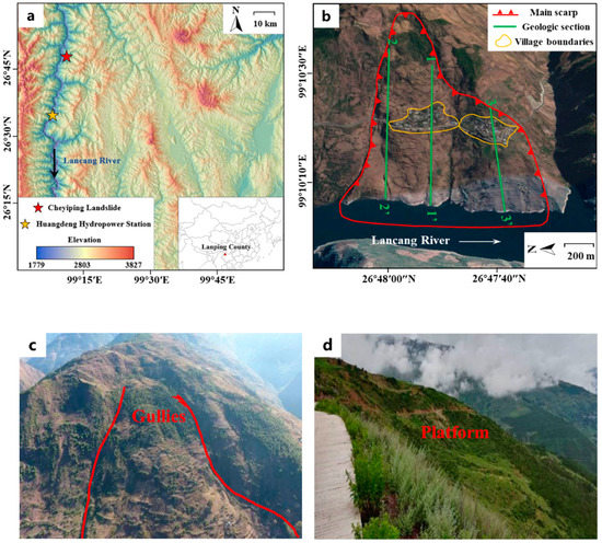 The Cheyiping landslide in the reservoir area of Huangdeng Hydropower Station: (a) Geographic location of the study area. (b) Aerial view of the Cheyiping landslide and locations of three cross-sections; (c) Gullies; (d) Platform; (e) Engineering geological map of the landslide; (f) Geological cross section alone profile 1-1′.