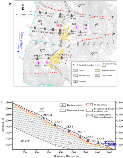 The Cheyiping landslide is located in the upper reaches of the Lancang River, Lanping County, the central area of the World Natural Heritage of Three Rivers Parallel. It is a typical recurrence reservoir landslide and is about 39 km away from the Huangdeng Hydropower Station (Figure 1a). It has a width of approximately 600 m and a length of about 1300 m, with a height difference from crown to toe exceeding 700 m, and the left and right sides are bounded by gullies (Figure 1b–e). The borehole data indicate that the landslide thickness is between 20 and 70 m, and the landslide volume is about 20 million m3. The upper and lower parts of the landslide are relatively steep, while the middle part where Cheyiping village is located is relatively gentle. Figure 1f shows the geological cross section along profile 1-1′. According to field investigation, the landslide material mainly consists of quaternary deposits with silty clay and fragmented rubble. The silty mudstone, argillaceous siltstone, and sandstone of the Middle Jurassic Huakaizuo Formation (J2h) constitute the underlying bedrock of the landslide [51]. According to the Varnes classification system [52,53], the Cheyiping landslide can be classified as a translational rockslide. The excessive landslide movement causes damage to the houses and other facilities on the slope (Figure 2).