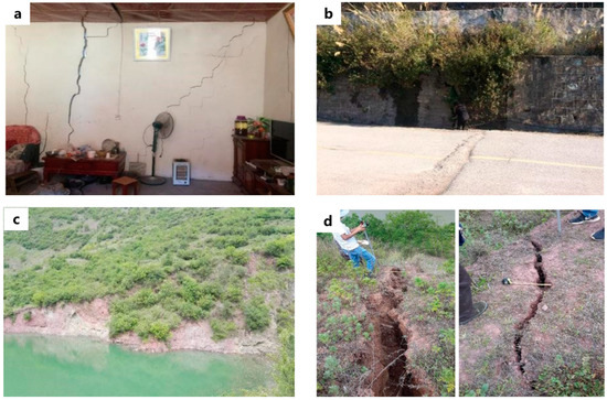 Field investigation of the Cheyiping landslide: (a) Damaged house; (b) Cracks in the road pavement; (c) Collapse of the reservoir bank; (d) Tensile cracks.