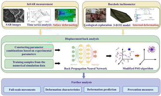 We combined multi-source deformation monitoring data and finite element simulation to investigate the deformation process of the Cheyiping landslide. A 3D finite element model of the Cheyipong landslide was established considering realistic geological and geomorphological conditions. The surface motion of the Cheyiping landslide was measured using InSAR. By combining the internal deformation monitored by borehole inclinometers and the surface deformation measured by the InSAR technique, the elasto-viscoplastic parameters of rock and soil masses were determined using the displacement back analysis method. The time-dependent deformation of rock and soil masses was considered in the finite element simulation to predict the development of the Cheyiping landslide. The flowchart of this study is shown in Figure 3.