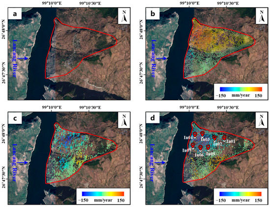 Mapping and monitoring of the Cheyiping landslide using Sentinel-1 InSAR data stack: (a) Aerial view of the Cheyiping landslide (b) Mean LOS displacement rate map of ascending InSAR measurements; (c) Mean LOS displacement rate map of descending InSAR measurements. (d) East-west displacement rate map.