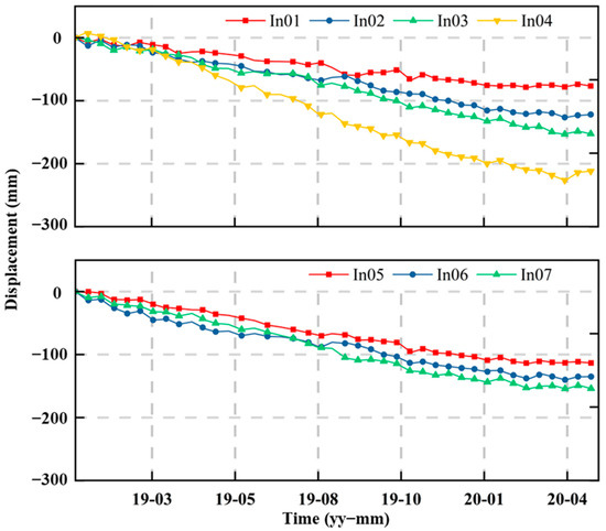 These deformation monitoring techniques and the time range of the data are shown in Figure 5. The inclinometer was installed in boreholes to monitor the internal deformation of the landslide. Thirteen boreholes with depths ranging from 51.64 to 80.49 m were drilled into the Cheyiping landslide in 2019. The installed borehole inclinometer has a biaxial probe containing two perpendicular accelerometers. The measurements are made from the bottom of the inclinometer. As the probe is gradually raised to the top of the casing, subsequent readings are taken. Because the rockslide deformation exceeds the measurement range of the inclinometer, the borehole inclinometer monitoring data was only available between September 2019 and May 2020.