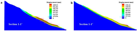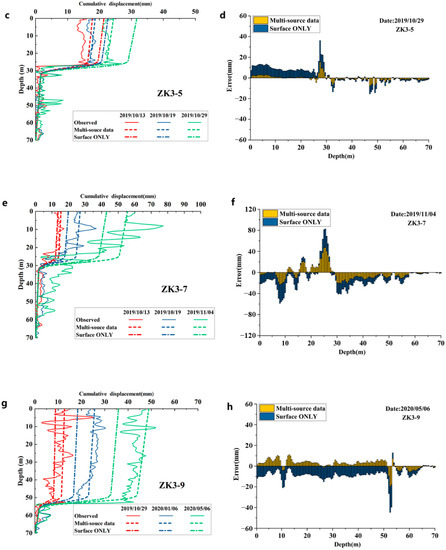 Figure 10a,b shows the displacement contours of section 1-1′ for the displacement back analysis using multi-source and “Surface ONLY” monitoring data. In both cases, the simulation results demonstrate a typical shallow landslide involving the movement of a relatively thin layer of the rock and soil masses. As shown in Figure 10c–h, using multi-source monitoring data in displacement back analysis, the simulation results with identified model parameters are much closer to the monitored displacements of boreholes ZK3-5, ZK3-7 and ZK3-9. This verifies that both surface deformation and internal sliding of the landslide can be accurately simulated by displacement back analysis using multi-source monitoring data. The above comparisons demonstrate the necessity of using multi-source monitoring data in displacement back analysis.