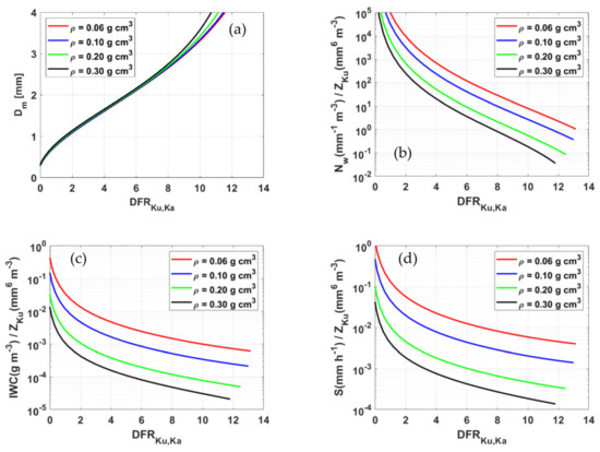 The dual-frequency ratios DFR versus Dm (a), Nw/ZKu (b), IWC/ZKu (c), and S/ZKu (d) as a function of DFR when the densities of the aggregate are 0.06 g cm−3 (red), 0.10 g cm−3 (blue), 0.20 g cm−3 (green), and 0.30 g cm−3 (black); note that the elevation of radar is 0° and = 0.