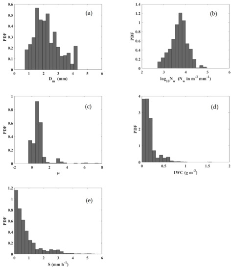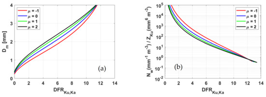 According to Equations (6) and (7), DFR is dependent on Dm for a given µ. From Equation (6), after retrieving Dm and measuring the radar reflectivity factor, Nw will be retrieved by looking up tables. Then, associated bulk parameters, such as the snowfall rate S and ice water content IWC, will be obtained: