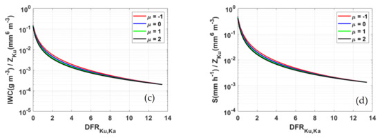 The dual-frequency ratios DFR versus Dm (a), IWC/Zku (b), S/Zku (c), and Nw/Zku (d) as a function of DFR when the μ values are −1 (red), 0 (blue), 1 (green), and 2 (black); note that the density of the aggregate is 0.10 g cm−3.