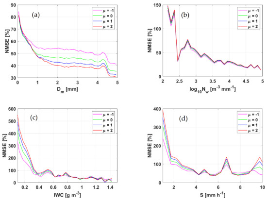 To assess the LUT method, measurements from the Ku- and Ka-band radars were used for retrieval, as shown in Figure 4. Dm had the smallest errors at µ = 2, and the errors of IWC, S, and Nw did not have large differences when the µ values were altered. Liao et al. [42] evaluated the performance of snow retrieval considering PSD models and scattering tables from the perspective of PSD measurements, and the relative errors in the estimates of IWC, S, Dm, and Nw were in the ranges of −40% to 70%, −50% to 40%, −30% to 50%, and −100% to 1000%, respectively. Although the errors of the results are still high in Figure 4, this is the first attempt to use a dual-frequency radar to retrieve microphysical snowfall parameters. The previous studies about retrieving microphysical parameters did not use measurements from a dual-frequency radar for retrieval [39,42].