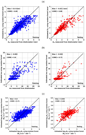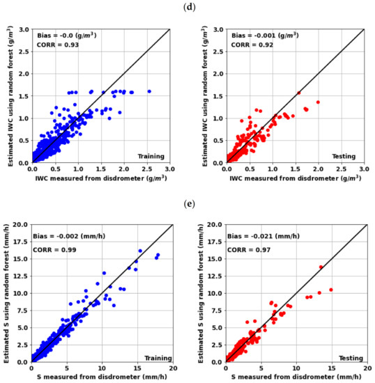 Figure 5 shows scatterplots of the PSD-observed and retrieved Dm, Nw, µ, S, and IWC from training and testing. Their bias and correlation coefficient are also presented in the figures. Table 4 lists some other statistical parameters, such as the mean absolute error, accuracy, training, and testing correlation coefficient. It is obvious that the RF model developed in this study to retrieve the microphysical parameters performed well, as shown in Figure 5 and Table 4. The DFR made a great contribution because the importances of DFR for Dm, Nw, µ, S, and IWC retrievals were 0.98, 0.79, 0.86, 0.95, and 0.97, respectively.