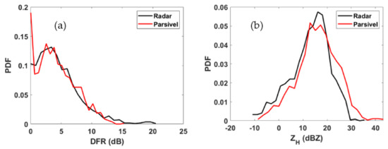 Probability density of DFR (a) and Z (b) from the observations of the D3R radar and calculated from PSD measurements.