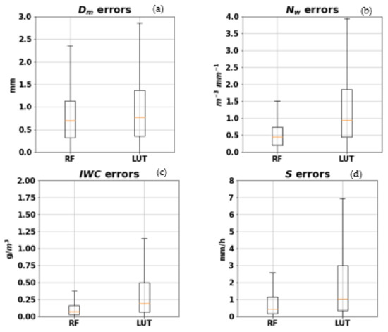 Figure 7 presents the distributions of the absolute error between the RF and the LUT retrievals and PSD measurements. The RF retrievals offered considerable advantages compared with the LUT method. The mean absolute error of Dm was about 0.7 mm using the RF method and about 0.75 mm using the LUT method. The mean absolute errors of log10Nw, S, and IWC using RF were 0.45 (Nw in mm−1m−3), 0.4 mm/h, and 0.10 g m−3, respectively. As for using the LUT method, the mean absolute errors of log10Nw, S, and IWC using RF were 0.9 (Nw in mm−1m−3), 1 mm/h, and 0.20 g m−3, respectively. The errors of all quantities from RF were small. The 25th and 75th absolute errors of the microphysical parameters based on RF were far less than those of the results using the LUT method.