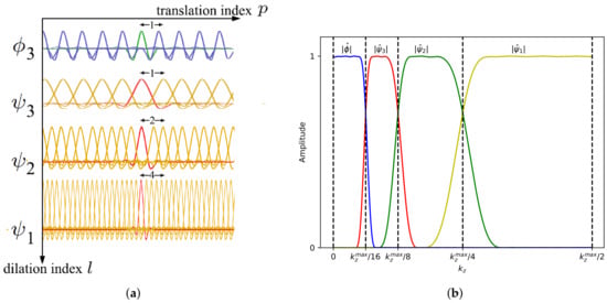 where corresponds to the set of relative integers. In order to cover the lowest part of the spectrum and the continuous part, the scaling function of non-zero mean is added to the family. Thus, an orthonormal basis is obtained. An example of the spatial and spectral coverage of this multi-resolution basis is pictured in Figure 1. In Figure 1a, the spatial coverage of wavelets of each level is shown, while in Figure 1b the spectral coverage for each level is plotted.