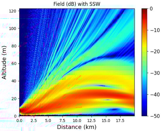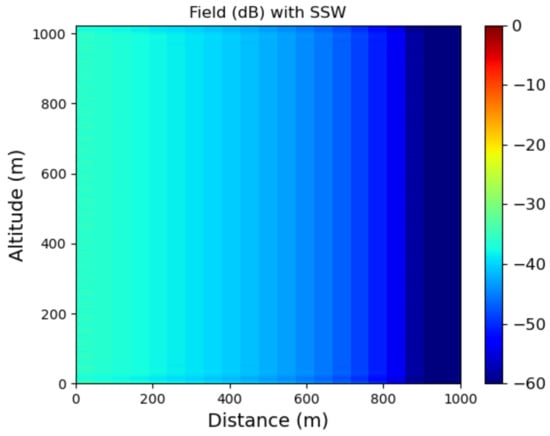 We now study the propagation in a maritime environment, as in [,]. In particular, we apply the SSW method with the hybrid approach for the sea to optimize the antenna location for given conditions.