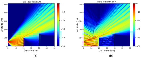 Here, the propagation from a complex source point [] in the S-band, GHz, is studied. The source is placed at m and m with a width of m. The computation domain is [0, 60,000] × m. The steps along both axes are m and m. To validate the method in this case, a PEC ground condition is considered, and we assume . We also consider two knife-edge reliefs placed at km and km at altitude m and m, respectively. Here, the thresholds are set using the theoretical formula in [], such that a maximum error of dB with SSF is obtained. Note that the thresholds also correspond to the implicit stopping criterion of SSW.