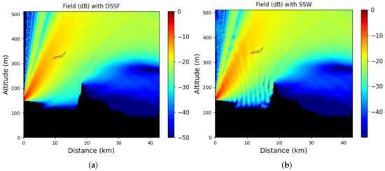 Figure 10 shows the differences in the prediction of the radar coverage between the one-way and two-way methods. Indeed, in between both reliefs the two-way SSW scheme takes into account the backward propagation. Thus, an interference pattern appears, but no shadowy areas above m appear due to the multiple reflections, which is very important in the context of radar coverage. Therefore, a landing plane, such as the gray one, is spotted by the radar. Otherwise, after km, one can see that both methods give the same result. Moreover, the difference between both methods is small, as can bee seen in Figure 11. Thus, even with the reflections, an airplane can be spotted.