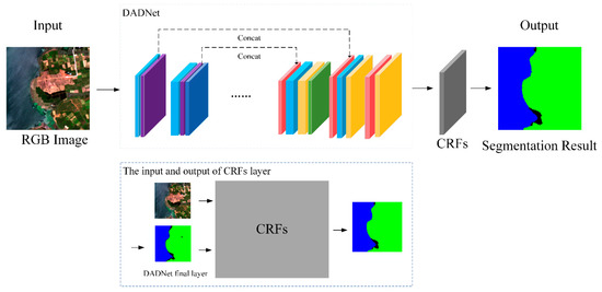 The DADNet-CRFs model combines the DADNet and CRFs modules (Figure 1). DADNet is the application of the dense convolutional module of DenseNet to the encoding-decoding structure of U-Net model [30], and incorporates the channel attention mechanism and spatial attention mechanism atrous spatial pyramid pooling (ASPP) [31] method to enhance the model’s ability to learn contextual semantics and spatial features. Deep separable convolution is used to reduce the number of parameters and improve the training efficiency of the model. The input of the CRFs module is the result of DADNet, thus further optimizing the model results for edge segmentation and improving the overall continuity of the segmentation results.