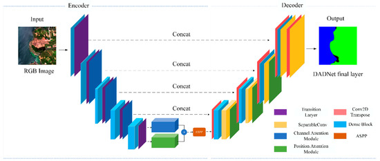 The DADNet model is a convolutional neural network built based on DenseNet and a channel and spatial location attention mechanism. The former features reduces the number of parameters and improves the computational efficiency of a model; the latter is able to solve the semantic segmentation of objects at different scales, as well as the fusion of similar features. The model framework uses the classical full convolutional network U-Net with the addition of DenseNet, a two-way attention module, and ASPP in the encoder and decoder, as shown in Figure 2.