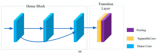 The DenseNet network structure is mainly composed of densely connected blocks and transition layers, as shown in Figure 3. The feature maps of each layer of the densely connected blocks are of the same size and can be connected in series over the channels. The combined function structure is a 3 × 3 Separable Convolution layer + Batch Normal layer + Rectified Linear Units activation function layer.