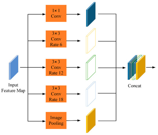 In high-resolution images, different scale features have obvious boundaries. The ASPP structure is used to fuse multi-scale information in order to increase the recognition ability of the model for multi-scale features. It learns the features of different scales by a set of dilated convolutions [33] with different sampling rates to improve the multi-scale feature segmentation accuracy. The ASPP structure is shown in Figure 6, and the specific calculation process is as follows.