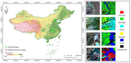 (Left): The geographical locations of GID images. This experiment selects 120 training images and 30 validation test images, which are marked with green and red respectively. (Right): Examples of GID images and their corresponding label. The RGB of each feature in labels: built-up (255,0,0), farmland (0,255,0), forest (0,255,255), meadow (255,255,0), water (0,0,255), background (0,0,0).