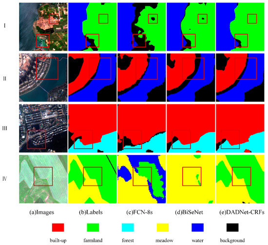 In Group III: BiSeNet segmented the areas better than FCN-8s, but the Built-up area and Forest contours were too smooth, and DADNet-CRFs preserved the spatial patterns of land types well.