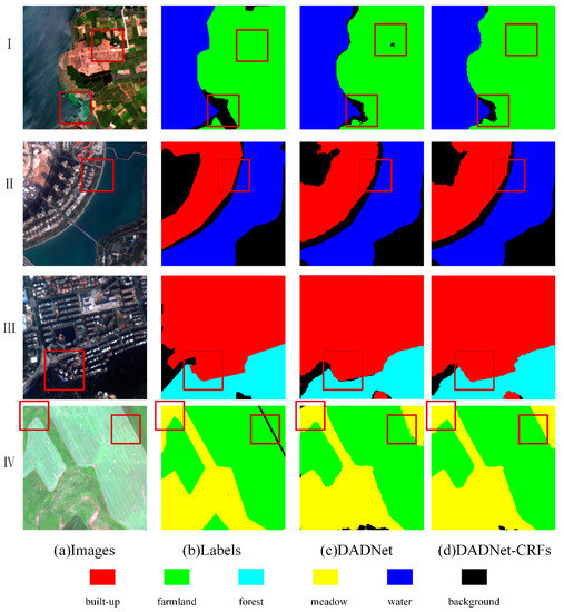In Group III: DADNet and DADNet-CRFs showed clearer classification for Forest and Built-up area, but the Built-up area was enlarged to different degrees. Moreover, there was a gap between Forest and Built-up in DADNet classification results, while DADNet-CRFs did not have this problem and showed smoother performance on the edges.
