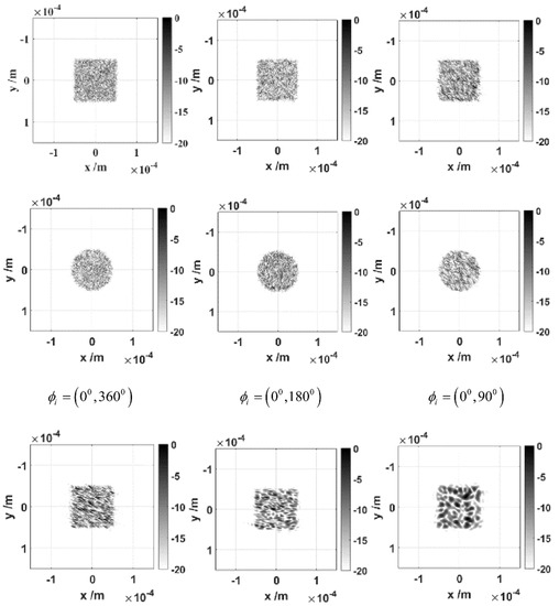 ISAL imaging of a rough square plate and a rough circular plate was simulated. The circular plate and square plate model parameters were as follows: the surface material was aluminum, the central frequency of the incident wave was 193.46 THz, and the corresponding wavelength was 1.55 μm. The complex refractive index of aluminum at this wavelength was 1.5785 + 15.685i, and the relative dielectric constant was (–242.68, 49.5) [25]. VV polarization was adopted, the frequency band width was 30 THz, the frequency sampling point was 16, and the unit interval of the rotation angle was 0.1°. The root mean square height was 0.25λ, the correlation length was λ, and the observation angle was 30°. The ISAL imaging results of the rough square plate and the rough disk under different rotation angle ranges were observed. The simulation scale of the rough square plate was 64λ × 64λ; the simulation scale of the rough circular plate was 32λ × 32λ.
