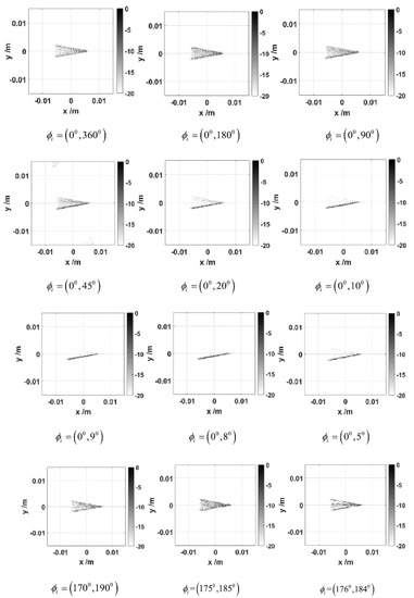 Through analysis of the imaging results of the rough cone ISAL with different rotation angles, the results of the rough target (cone) and the rough flat plate were basically the same. Among them, the rough cone has a better imaging effect at around 10°, and the basic target shape could be reflected. At the same time, due to the symmetry, we chose to image around the cone tip attachment at 10° (the azimuth angle of the cone tip is 180°), and there is no strong scattering phenomenon of only the cone surface, as shown in Figure 3. Therefore, for the rough target, we selected a small rotation angle centered on the symmetry axis according to the symmetry, and a clear and complete ISAL image of the rough target could be achieved.