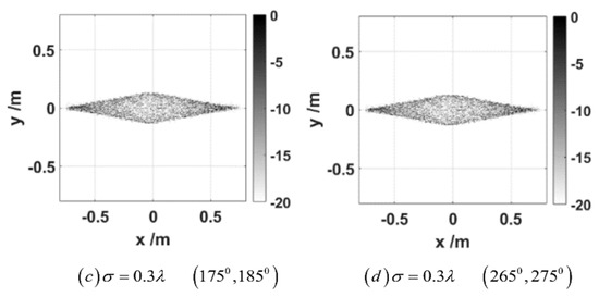 The ISAL imaging in Figure 5 clearly shows the shape of the double cone, which proves that ISAL imaging can clearly distinguish the rough double cone at different rotation angle ranges (under different symmetry axes) at a small rotation angle (10°). This is also different from the ISAL imaging of the blunt-nosed cones. For any rough target, the selected angle range can be different depending on the symmetry axis, but a clear ISAL image with a small rotation angle can be achieved. As the root mean square height decreases, the surface of the double cone becomes smoother, and the scattering distribution mainly comes from coherent scattering, concentrated at the edge of the double cone, so the edge of the double cone becomes brighter.