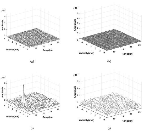 The detection scenario is shown in Figure 8a, where the target is a man raiding an electric bicycle moving tangentially relative to the radar. Since the position relative to the radar changes dramatically in a short period of time, it may lead to a partial correlation with the echo. His initial radial velocity is about 3 m/s; and the initial radial range is about 12 m. It is almost 40 range cells that the target has crossed although the radial velocity is apparently small. The echo data acquired through frequency-modulated continuous-wave radar is a kind of beat signal. The result after FFT is shown in Figure 8b. This operation is equivalent to pulse compression. The data have been transformed to a beat frequency domain. After this step, the target position cannot be seen in the graph, so it is necessary to perform a long-time integration. Figure 8c,d show the integration results of the GRT and GRFT, respectively. It is obvious that neither coherent integration nor noncoherent integration yield significant “spikes” in the cases in which the target echo is partially coherent. Figure 8e shows the integration result of the proposed method. The initial coherent integration segment is set to be ; that is, . After iterating four times, the system obtains the optimal output. The sought after coherent integration segment time is 0.04096 s. It is evident that the peak clearly appears in the correct motion of the target. Figure 8f shows the integration result of MTD-GRT method, and the coherent integration segment time is set to 0.04096 s. One can see that there is no “peak”. Figure 8g–j show the integration results of GRT, GRFT, the proposed algorithm, and MTD-GRT with the simulated data. The parameters of the simulated data are the same as those of the measured data. The initial coherent integration segment of the proposed algorithm is also set to be . In addition, the iterating time is also four to gain the optimal output. The integration results from Figure 8g–j are consistent with those from Figure 8c–f.