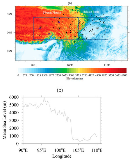(a) Topography of the Tibetan Plateau and Sichuan Basin, in which the black dots indicate the locations of the ground meteorological observation sites of the China Meteorological Administration; ‘×’ represents the radiosonde stations; and pentagrams represent the cloud radar observation sites. (b) Elevation goes along the line of 31.2°N marked with the dashed blue line in (a).