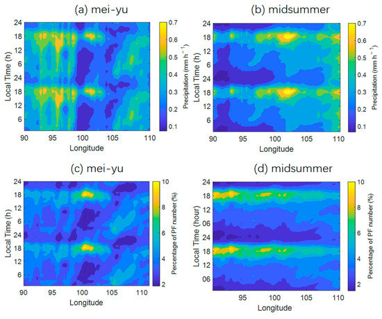 During the mei-yu period, the diurnal variation in precipitation from HE satellite estimates shows phase propagation from west to east over the SB (103°–110°E), while no such propagation can be seen over the TP (90°–102°E) (Figure 2a), which is similar to the results of [23]. The diurnal maximum precipitation rate over the TP is concentrated between 1500 LT and 2100 LT, and the diurnal minimum precipitation rate lies within 0000–1200 LT. Over the SB, meanwhile, the diurnal maximum precipitation rate occurs at night, and then decreases to a minimum in the morning, which was also found in previous studies (e.g., [42]). The result for the PF number percentage is similar to that of the precipitation amount, except the maximum PF number percentage occurs at the boundary of the TP and SB (Figure 2c), which is related to the convergence rising motion over the slopes in the afternoon and rising motion in the center of the SB at night. During the midsummer period, the diurnal variation in the precipitation rate shows no propagation from the TP to SB, which is different from the mei-yu period. The diurnal maximum precipitation rate is concentrated between 1500 LT and 2100 LT, while the diurnal minimum precipitation rate lies within 0000–0600 LT, which is similar to that during the mei-yu period (Figure 2b). The average precipitation rate over the SB is larger than that over the TP. The result for the PF number percentage is similar to that of the precipitation amount (Figure 2d). The reasons of the diurnal propagation of rainfall are related to the decreases in the zonal wind profile from the mei-yu to midsummer period and the diurnal cycle of low-level winds over the SB [23].