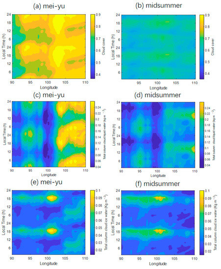 The diurnal variations in cloud cover, LWC, and IWC from ERA5 are shown in Figure 3. During the mei-yu period, the diurnal variation in cloud cover (Figure 3a), LWC (Figure 3c), and IWC (Figure 3e) shows propagation from west to east over the SB, while no diurnal propagation is apparent over the TP. The diurnal maximum cloud cover and LWC over the TP is concentrated between 1800 LT and 0300 LT, while over the SB they lie within 1500–2400 LT. The diurnal minimum cloud cover and LWC lie within 1000–1500 LT over both the TP and SB. The cloud cover and LWC at the border of the SB and TP are smaller than those over the inner parts of the two regions. The cloud cover and LWC in the SB are larger than those over the TP. The diurnal maximum IWC over the TP is concentrated between 1500 LT and 2100 LT, while the range for the diurnal minimum IWC is 0600–1200 LT. Over the SB, the diurnal maximum IWC is in the mid-afternoon to early evening (1500–2100 LT) and then decreases to a minimum during the morning (0600–1200 LT). The cloud IWC over the edge of TP and SB is larger than that over the inner TP and SB.