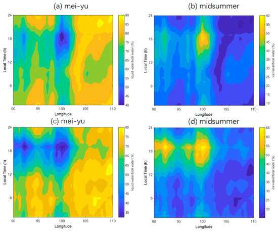 Ratio of cloud (a,c) liquid water and (b,d) ice water to total cloud water during the (a,b) mei-yu and (c,d) midsummer periods.