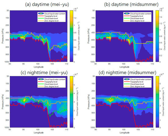 The pressure level of cloud liquid water content (shaded color), cloud base (green line), zero degree level (orange line), and the topography (red line) along with longitude during the (a,b) mei-yu and (c,d) midsummer periods during the (a,c) daytime and (b,d) nighttime.